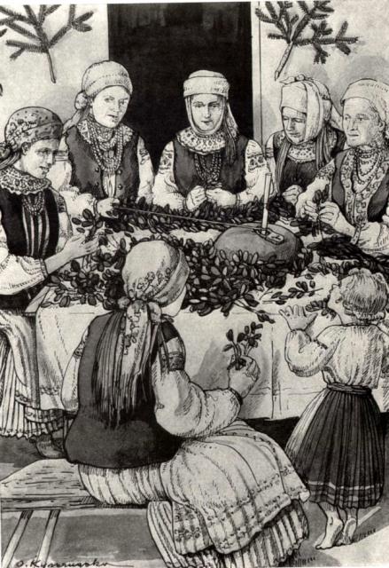 На картині О.Кульчицької зображено обряд вінкоплетин на бойківщині. Гурт заміжніх жінок сидить за столом, на якому розкладений барвінок. В центрі столу знаходиться хліб, в який ввіткнуто свічку, на яку в свою чергу вчеплено закритий замок (він символізує цнотливість молодої). Жінки зачіпляють за свічку нитки, до яких кріпиться гірлянда з барвінку.