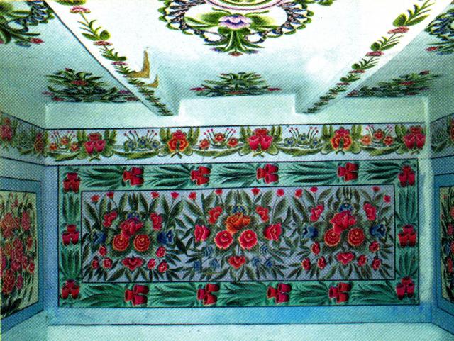 Хати могли прикрашались як ззовні, так і зсередини. Розписи, як правило, робилися на усіх стінах, навколо вікон, на лежаках та стелі. Особлива увага приділялася печі, символу родинного вогнища.