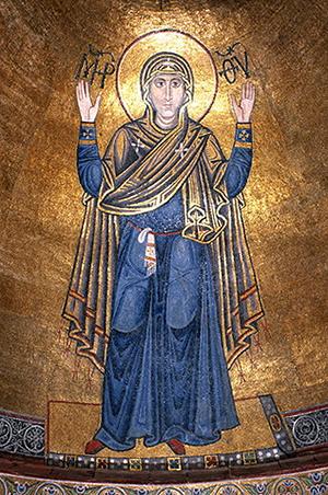 Князь Ярослав Мудрий після перемоги над печенігами у 1036 р. на пошану Богу та Богородиці, побудував величний собор св. Софії та храм Благовіщеня на Золотих Воротах у Києві. В останньому у 1037 р. він офіційно проголосив Пресвяту Богородицю Заступницею і Покровителькою своєї держави і народу. Багатьом киянам і нині добре відомий переказ про те, що Київ доти стоятиме на землі, доки буде непорушним у Софійському соборі образ Божої Матері Оранти з руками, складеними у прохальній молитві за весь люд християнський.